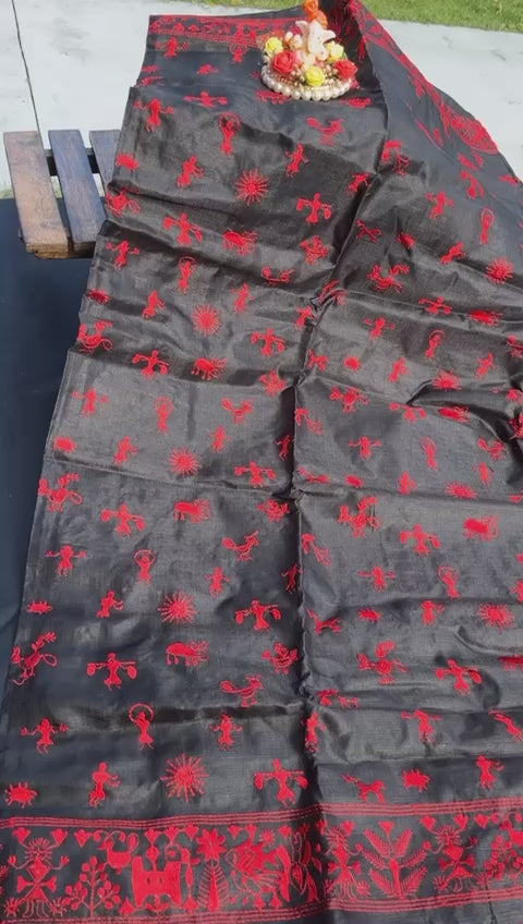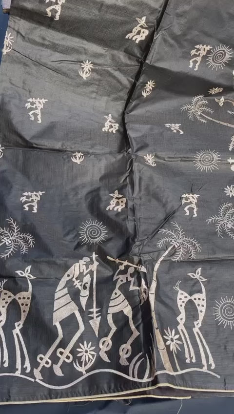 *semi Desi tussar silk all over border and body embroidery work tribal figure art traditional in chhattisgarh with blouse*